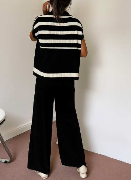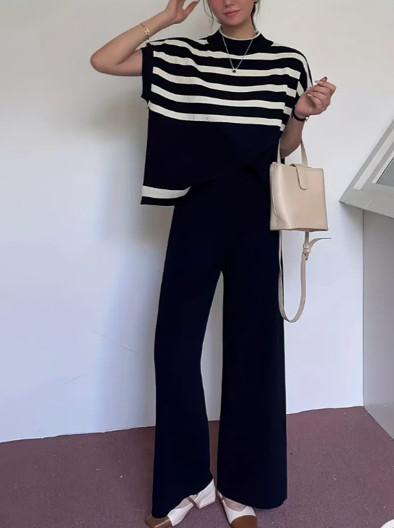 Ensemble femme deux pièces chic avec top rayé ample et pantalon large