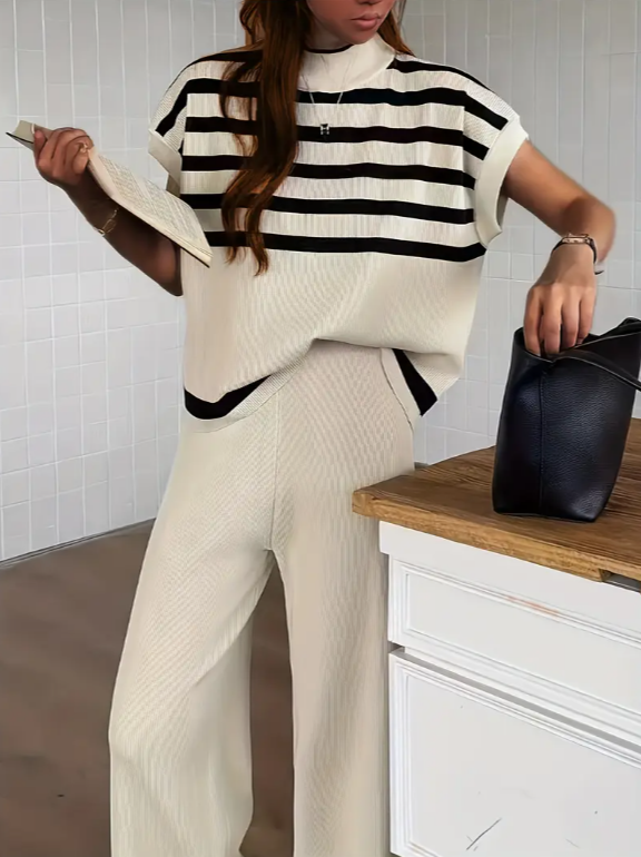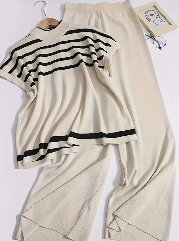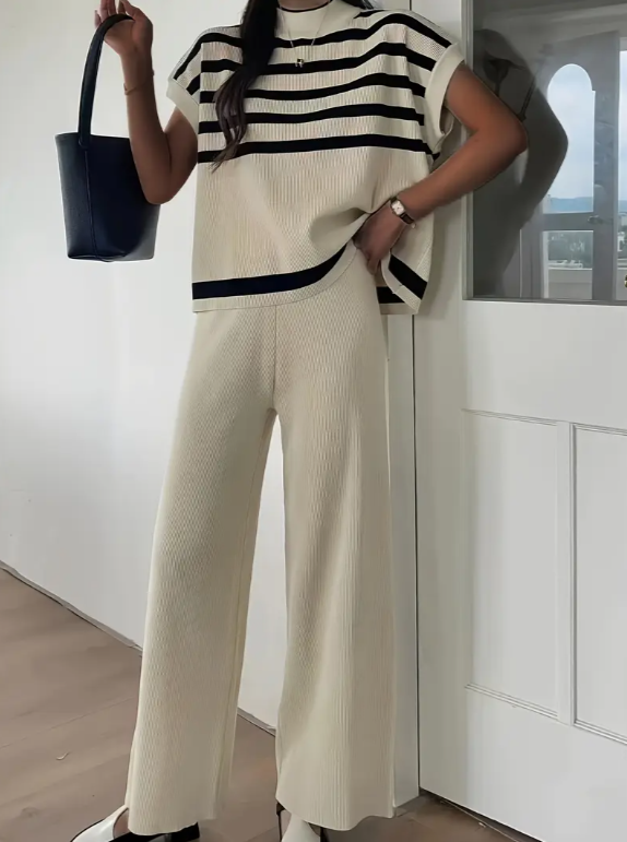 Le top présente un col rond, des manches tombantes et un motif à rayures contrastées. Le pantalon est fluide, confortable, et doté d'une taille élastique pour un ajustement parfait. Disponible en tailles XS à L et en deux coloris classiques : beige et noir.