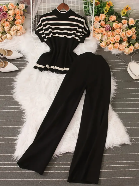 Ce bel ensemble deux pièces pour femme associe style minimaliste et confort. Il comprend un top rayé à coupe ample et un pantalon taille haute à jambes larges. Idéal pour une tenue décontractée avec une touche soignée.