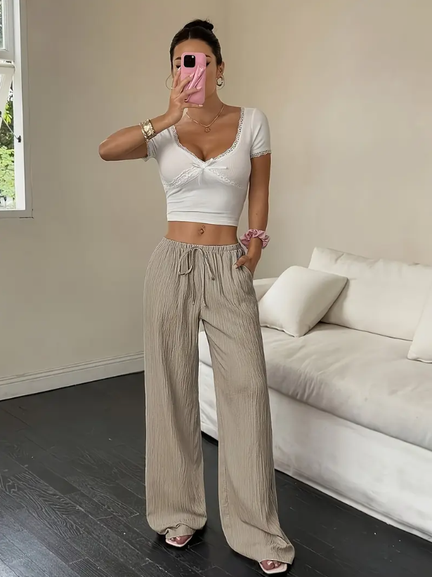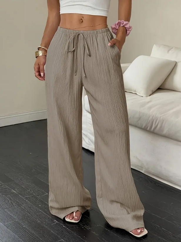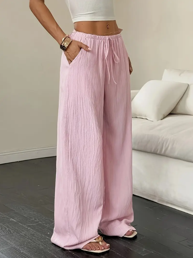 Disponible en rose doux et en kaki naturel, deux teintes faciles à combiner avec des hauts d’été. Ce pantalon s’adapte à un style décontracté ou quotidien, avec un t-shirt, un débardeur ou une chemise légère.