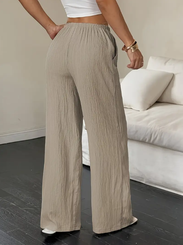Ce pantalon large pour femme est conçu pour un usage quotidien durant les saisons chaudes. Sa coupe fluide et droite offre une grande liberté de mouvement, avec un style simple à associer. Le tissu léger et texturé apporte un confort agréable tout au long de la journée.
