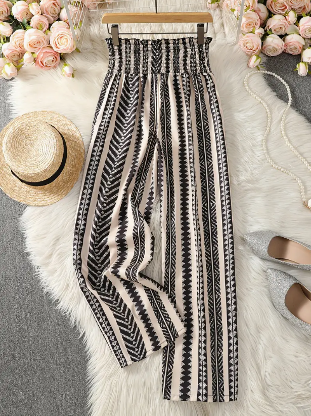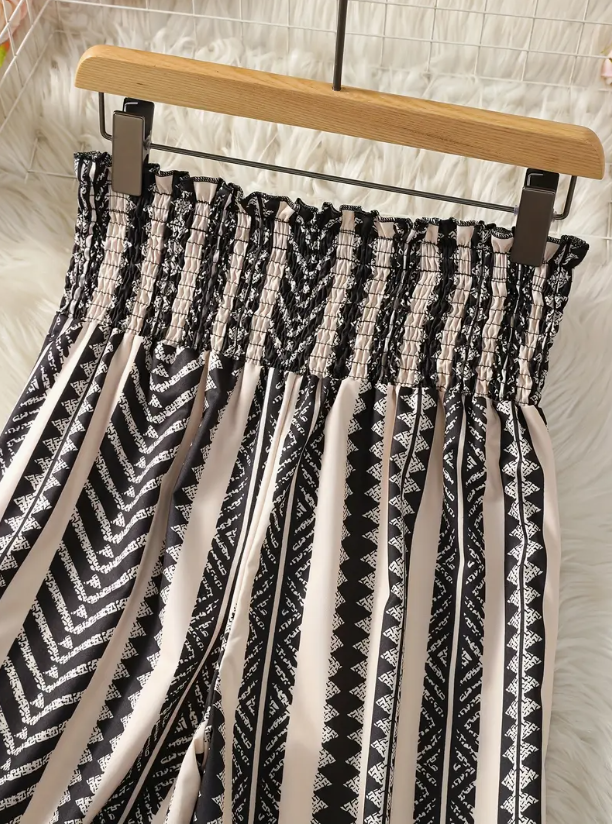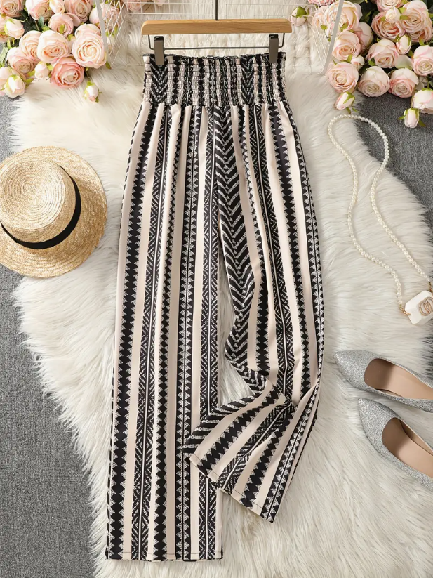 Pantalon large femme à rayures noires et blanches avec taille smockée