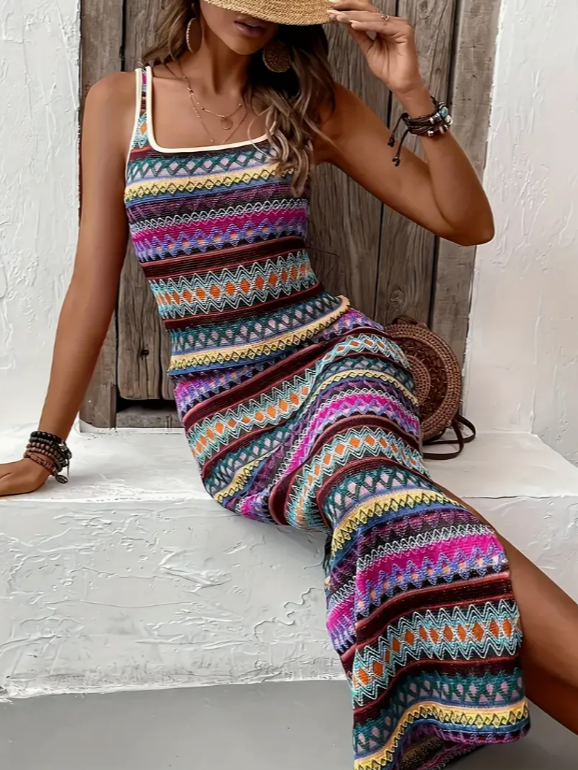 Cette robe longue pour femme est conçue pour un style d’été dynamique et confortable. Son imprimé ethnique multicolore attire le regard, tandis que sa coupe près du corps met en valeur la silhouette. La robe est dotée de fines bretelles, d’une encolure carrée et d’une fente latérale pour une touche fluide et moderne.
